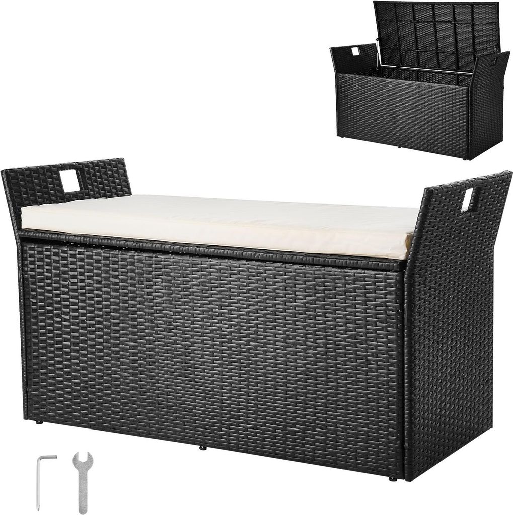 Sitzbank mit Kissen und Stauraum, Gartenbank mit abnehmbarem waschbarem Bezug, Schwarz Poly Rattan