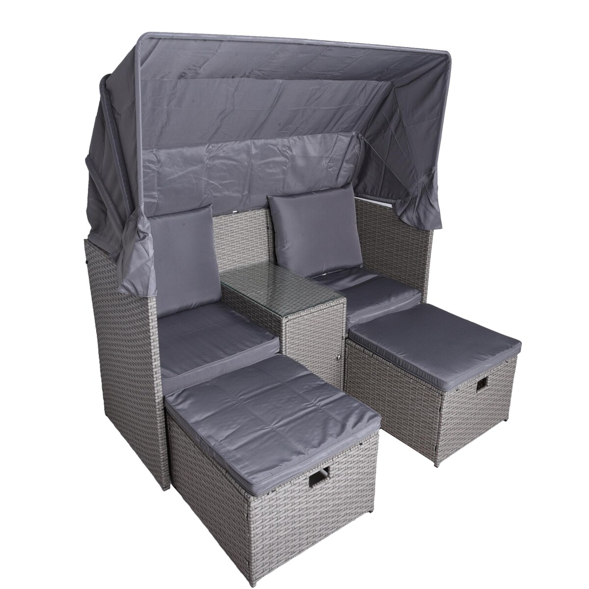 Gartenmuschel MAINZ mit Hocker Beistelltisch Sonnendach - Kunststoff, Grau | Sonneninsel Outdoor Gartensofa mit Dach Garten Pool