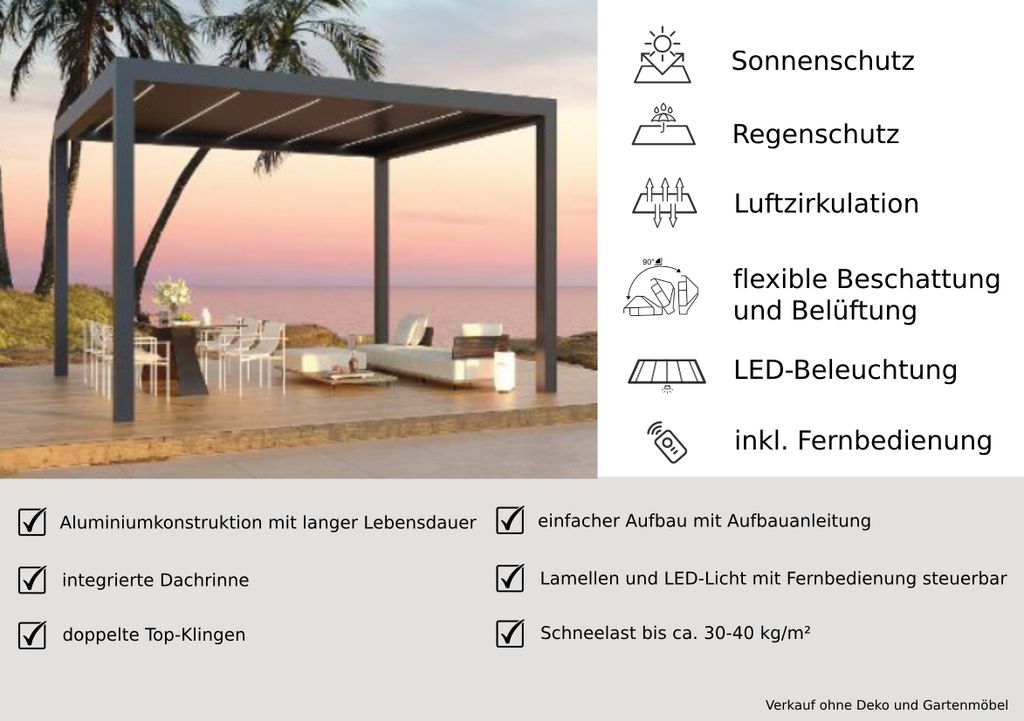 Pergola anthrazit inkl. LED Licht motorisiertem Dach 3x4x2,7m Gartenpergola