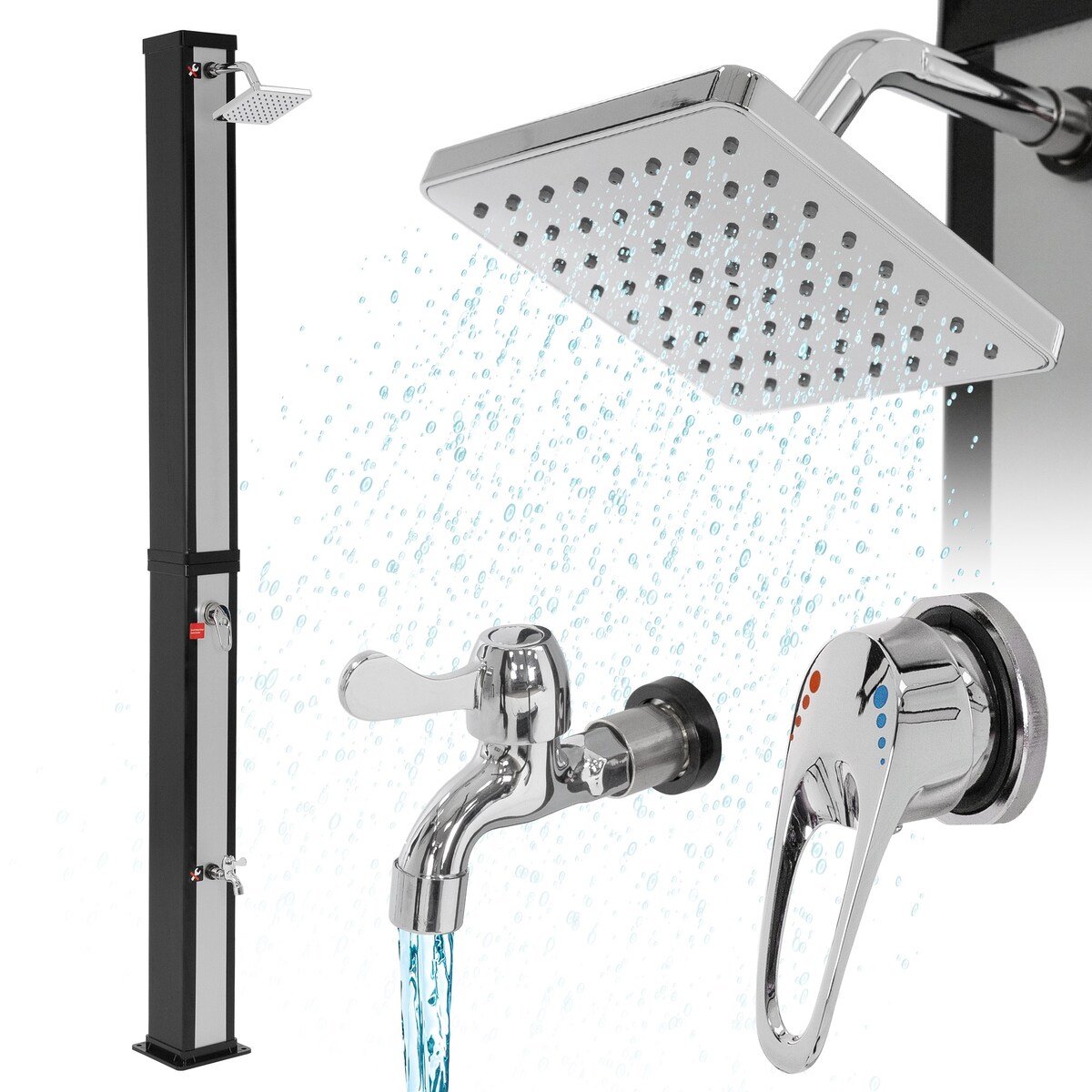 ML-Design Solardusche 40L Eckig 217 cm Silber-Schwarz – Mit Fußdusche & Regenduschkopf, bis 60°C warmes Wasser, Gartenschlauch-Anschluss, Außendusche