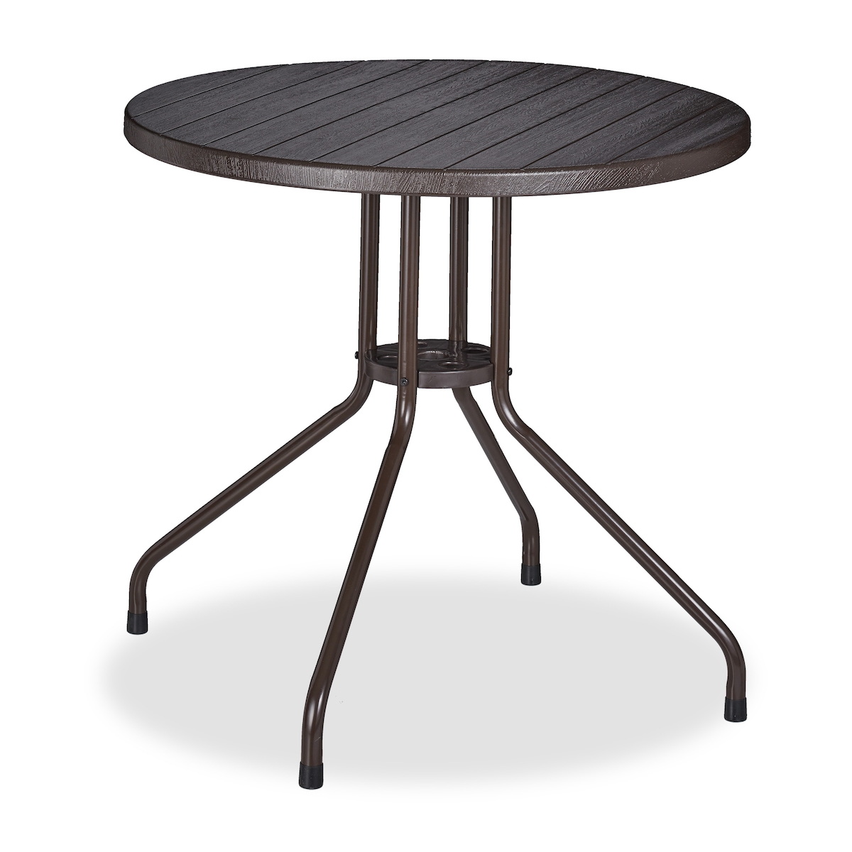 Relaxdays Gartentisch, Holz-Optik, runder Outdoortisch, Kunststoff, Metall, robust, Balkontisch, HxD: 75 x 80 cm, braun