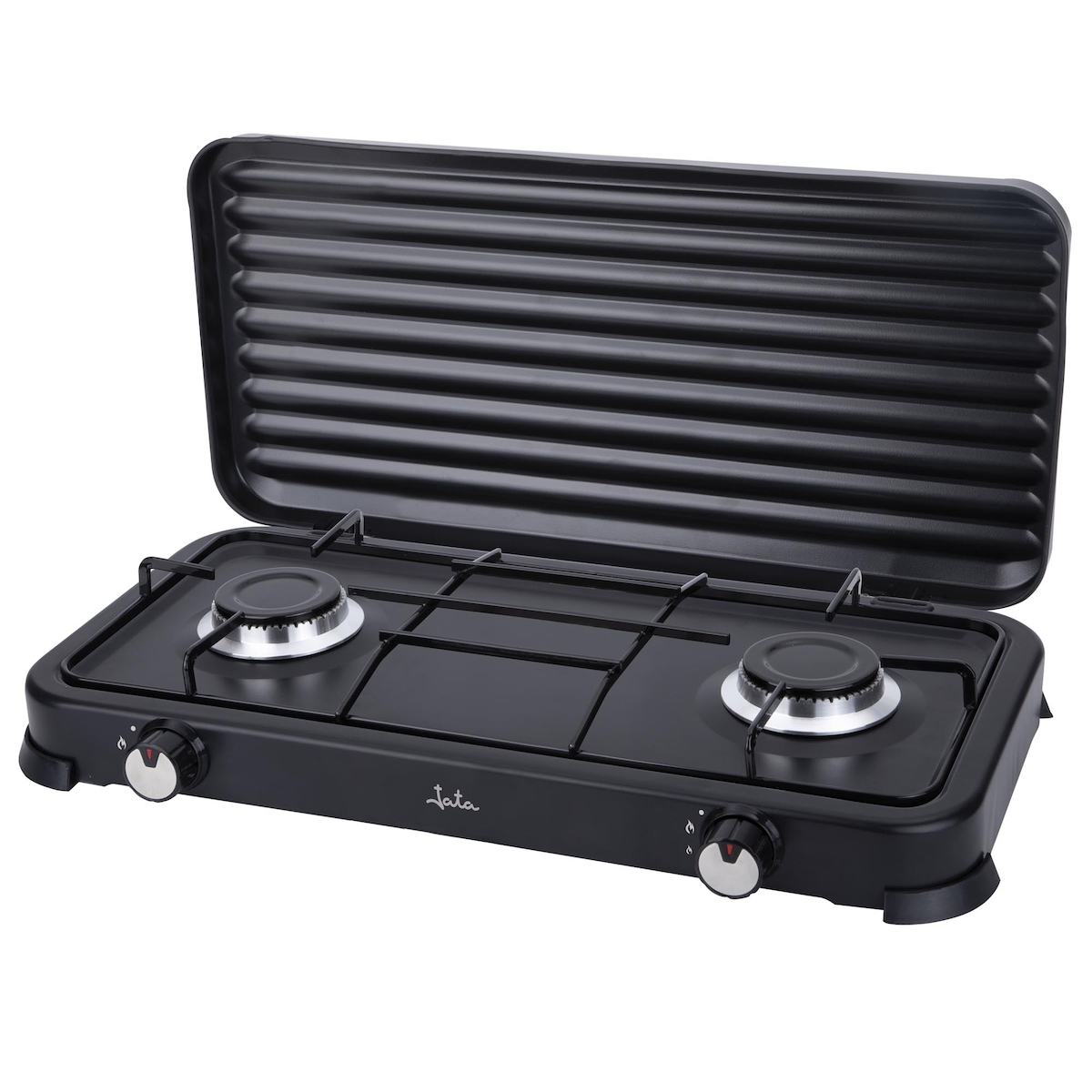 JATA JECG2702 - Tragbarer Gaskocher mit 2 Brennern und Grill. Für Butan- und Propangas. Abnehmbare Schutzabdeckung. Ideal für Camping. Platzsparend
