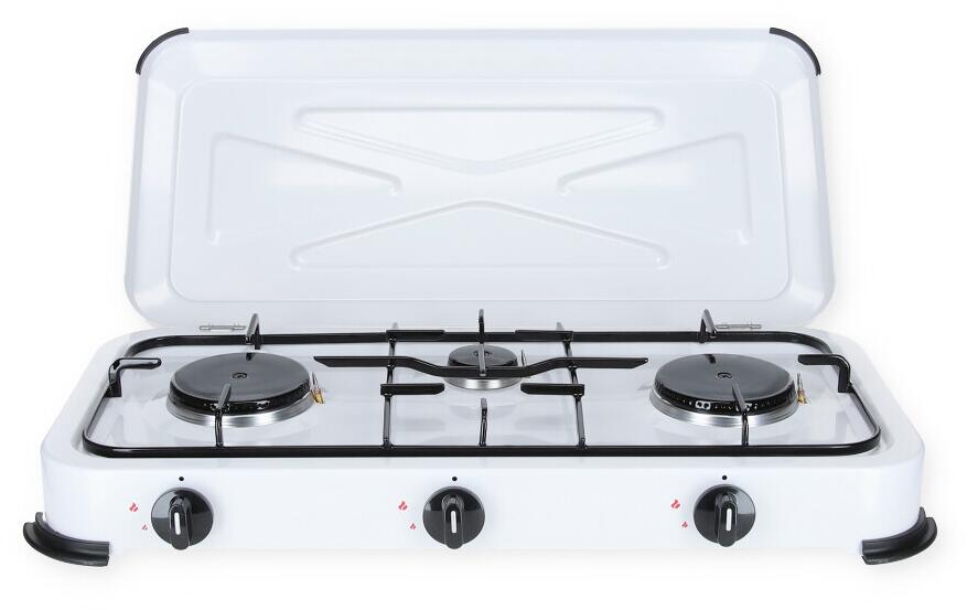 Tragbarer Gaskocher mit 3 Flammen 3450W Weiß lackiert Deckel Kochplatte + Gasschlauch KEMPER