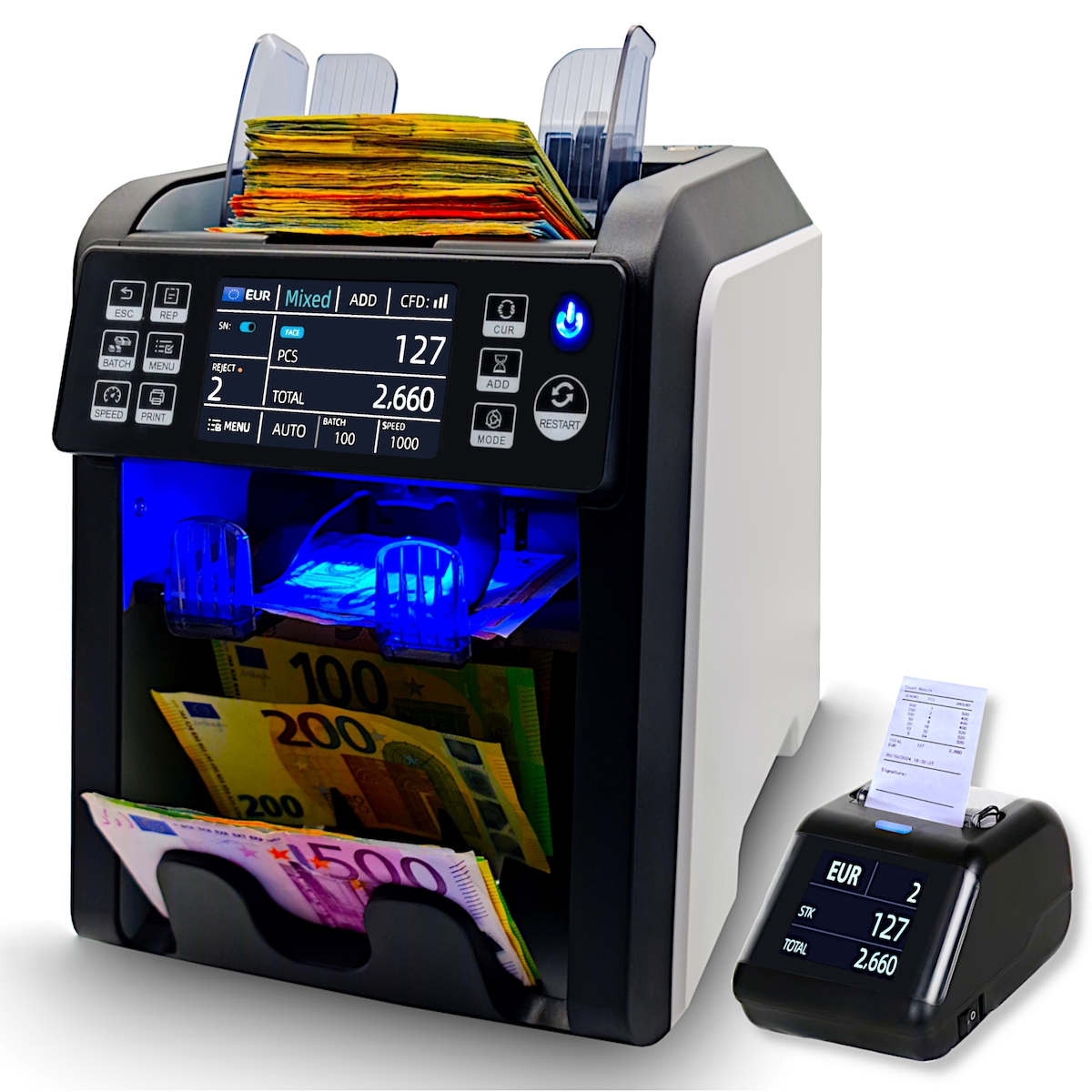 Jubula MV-500 Geldzählmaschine für gemischte Geldscheine Bundle mit Jubula MPR-1 Thermodrucker | Sicher| Exakt| EUR USD GBP SEK usw.| Banknotenz...