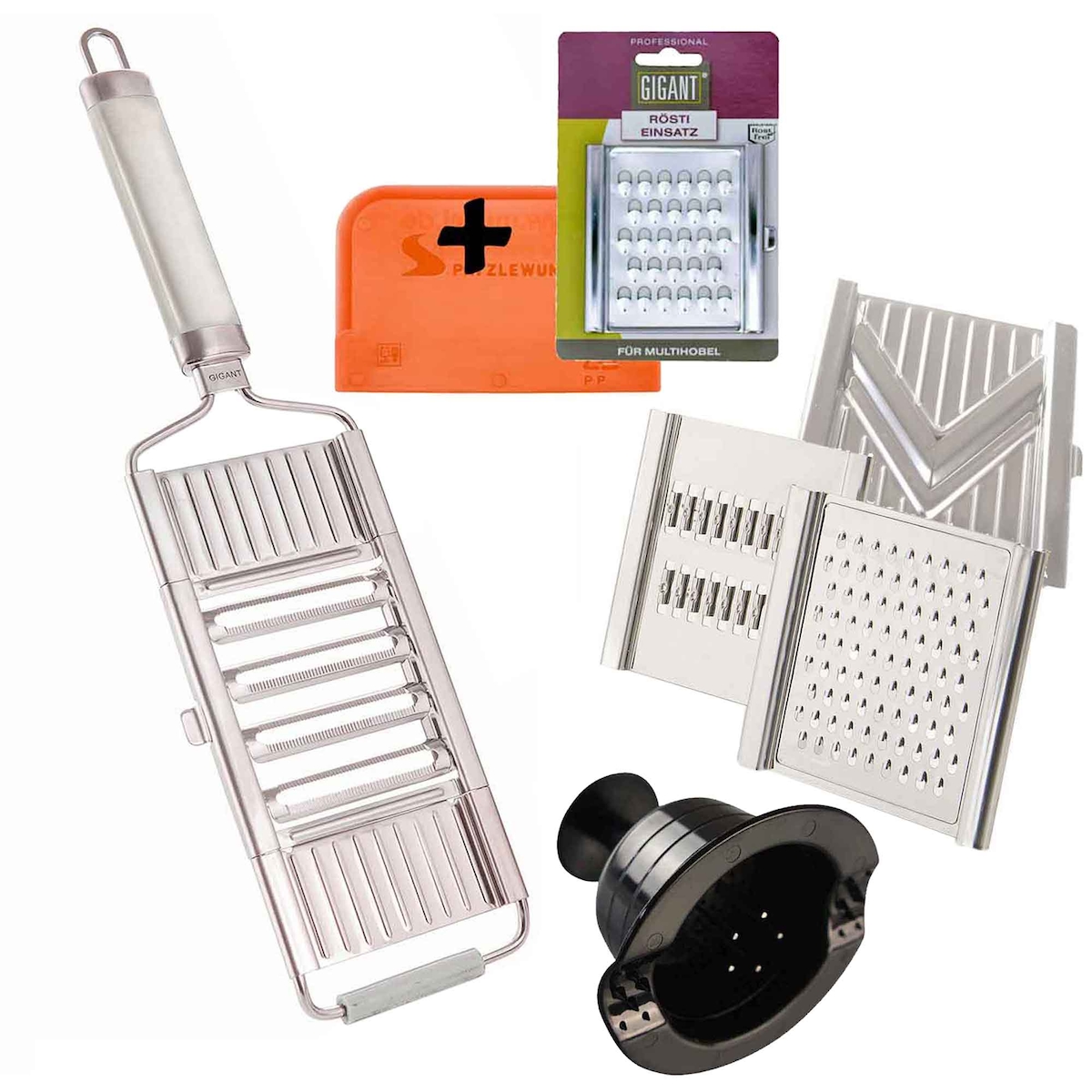 Gigant 4-fach Gemüsehobel mit 5 zusätzlichen Einsätzen und Sparschäler Edelstahl