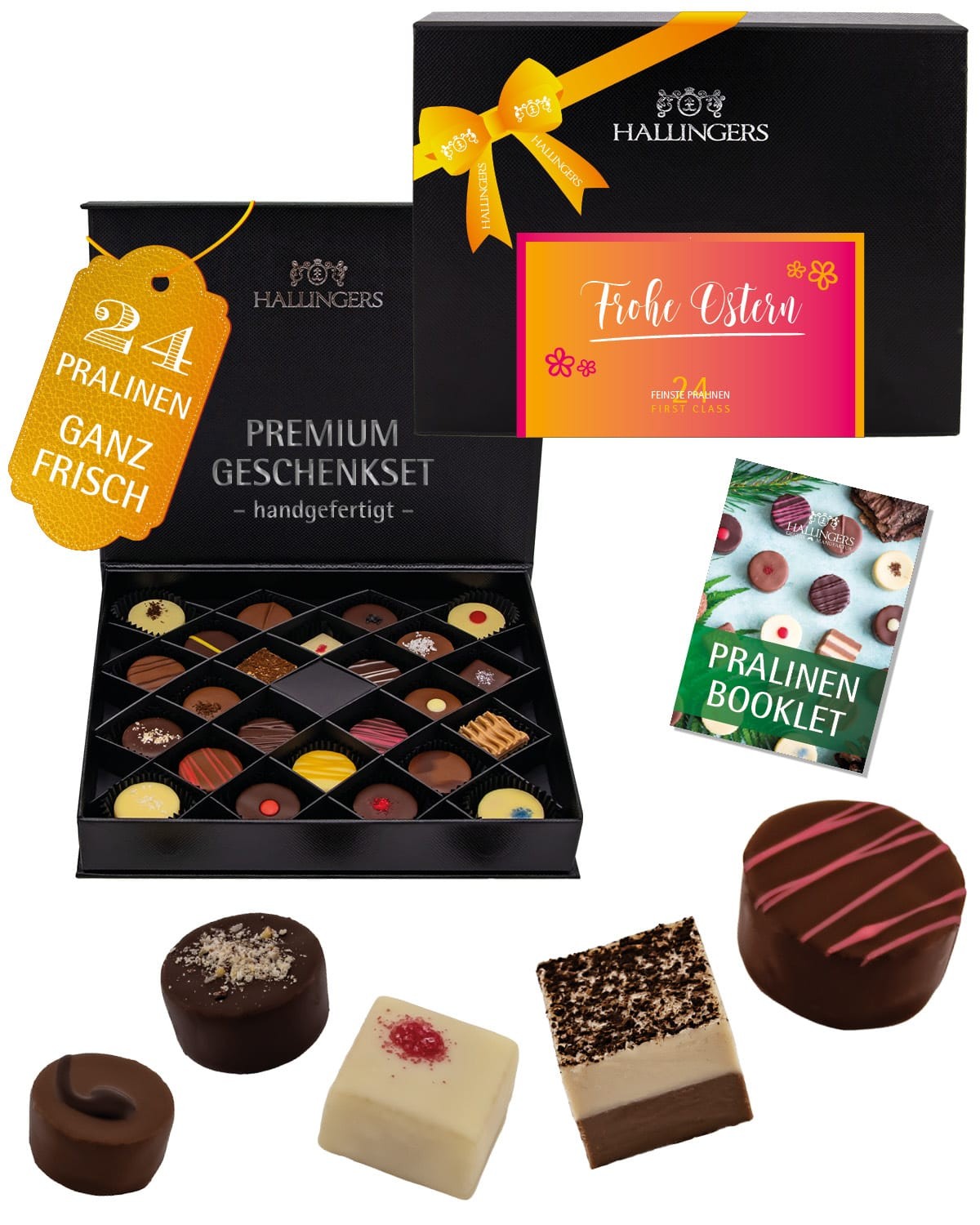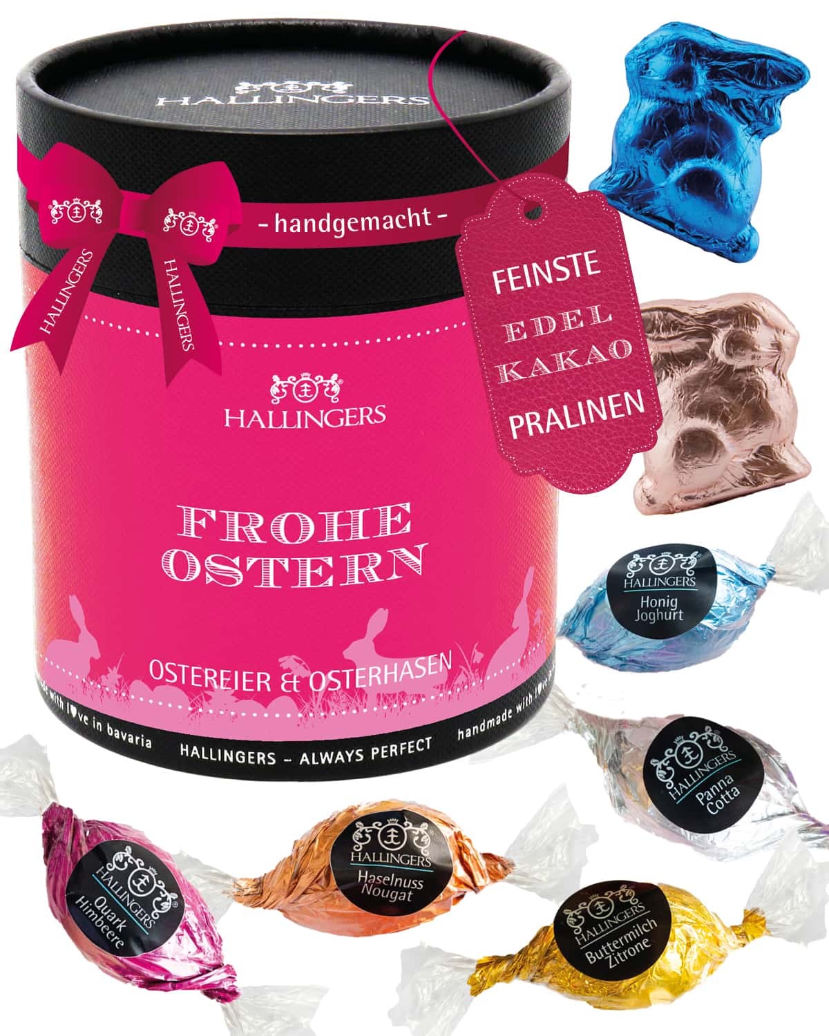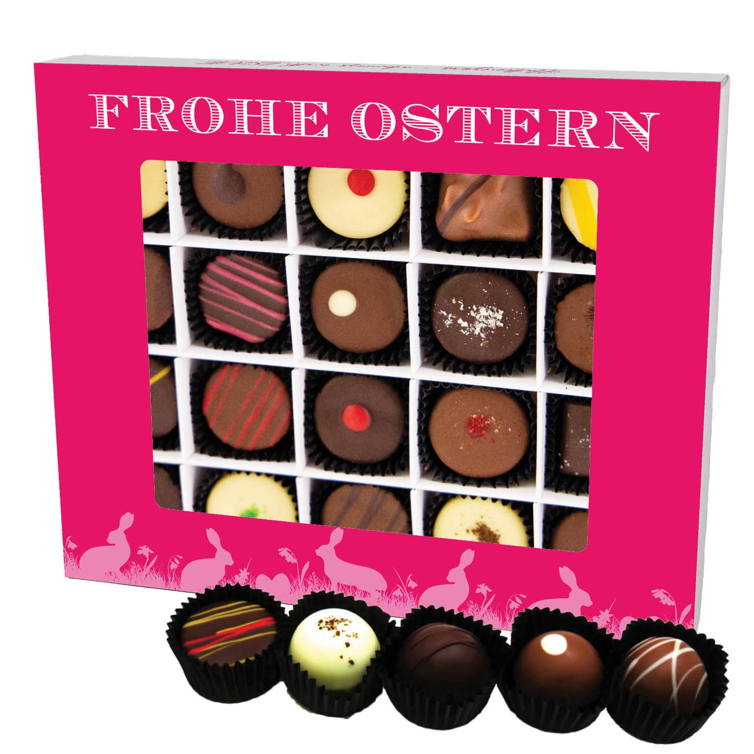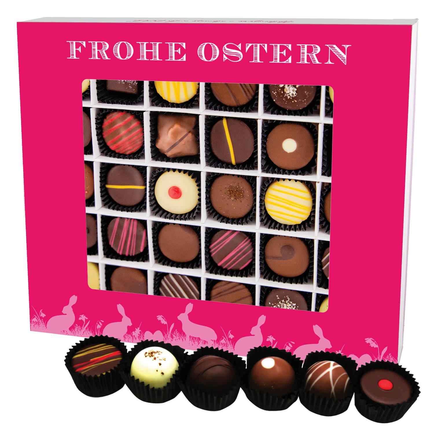 Pralinen Ostergeschenk – ohne Alkohol, handgemacht & zart schmelzender Edelkakao in edler Geschenkbox "Frohe Ostern Pink", feine Confiserie-Qualität f