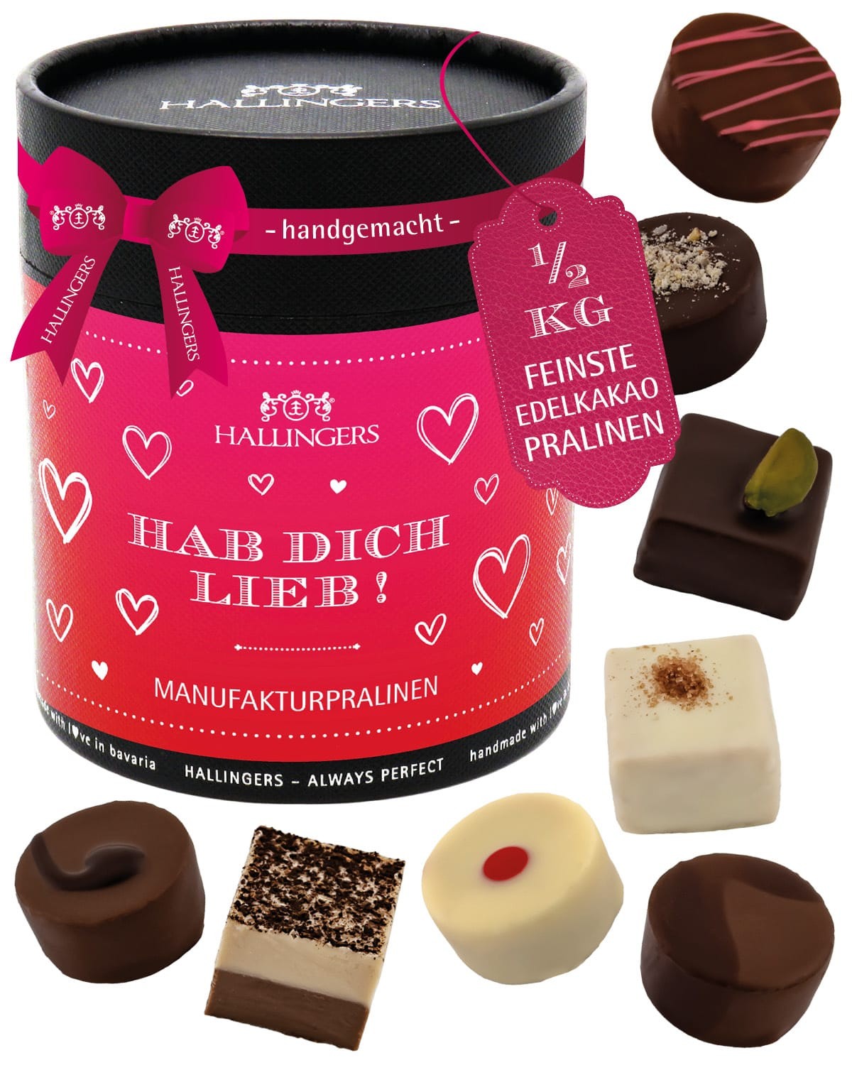 Pralinen Geschenk Valentinstag – handmade ohne Alkohol aus Edelkakao-Schokolade edle Geschenkdose "Hab Dich lieb XXL", Confiserie-Qualität für ihn sie