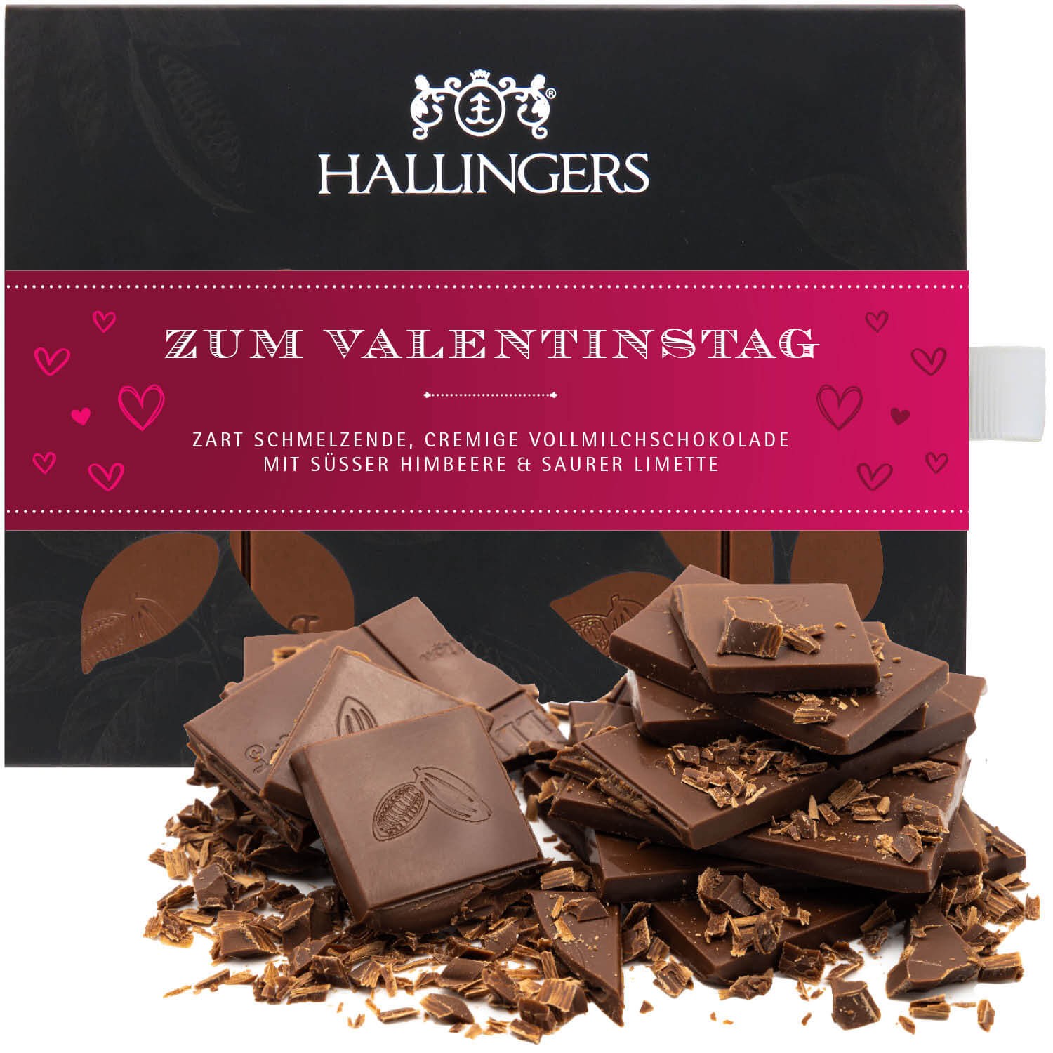 Schokolade Geschenk Valentintstag - handmade ohne Alkohol aus Edelkakao, edle Tafel-Geschenkbox "Zum Pink", Vollmilch mit Himbeere & Limette - für sie