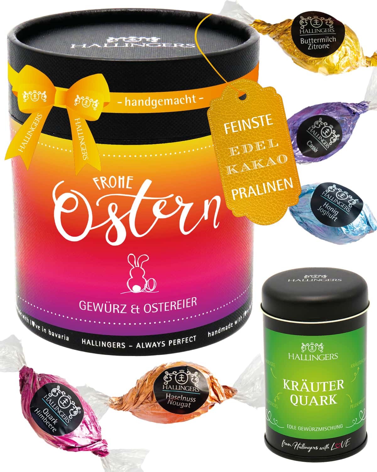 Geschenkkorb Geschenkset Ostern – Feinkost Mix mit 17 Pralinen Ostereier & Gewürz Kräuterquark, in edler Geschenkdose, Premium Osterkörbchen Geschenk,