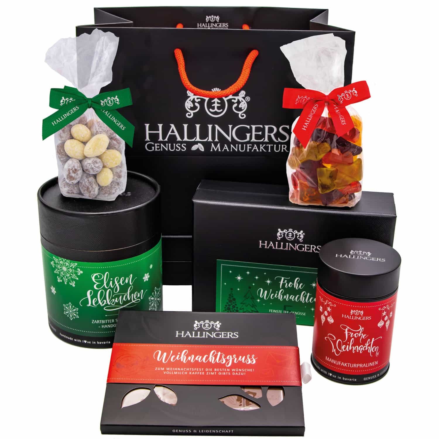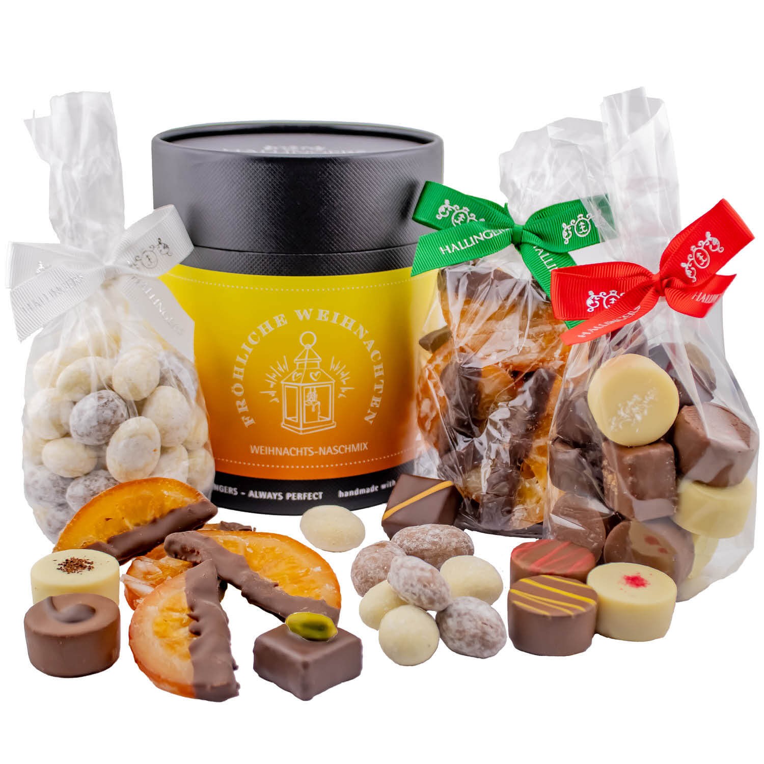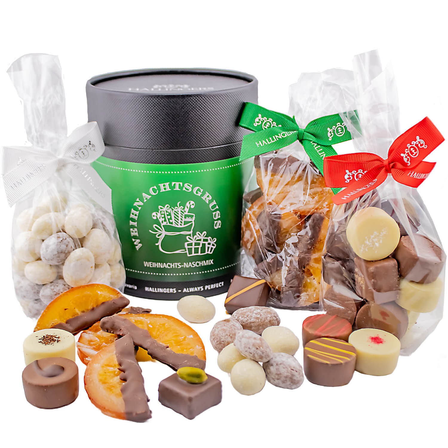 Geschenkkorb Geschenkset Weihnachten – Feinkost Mix mit Pralinen Mandeln Orangenscheiben, in edler Geschenkose, weihnachtliches Premium Geschenk, "Frö