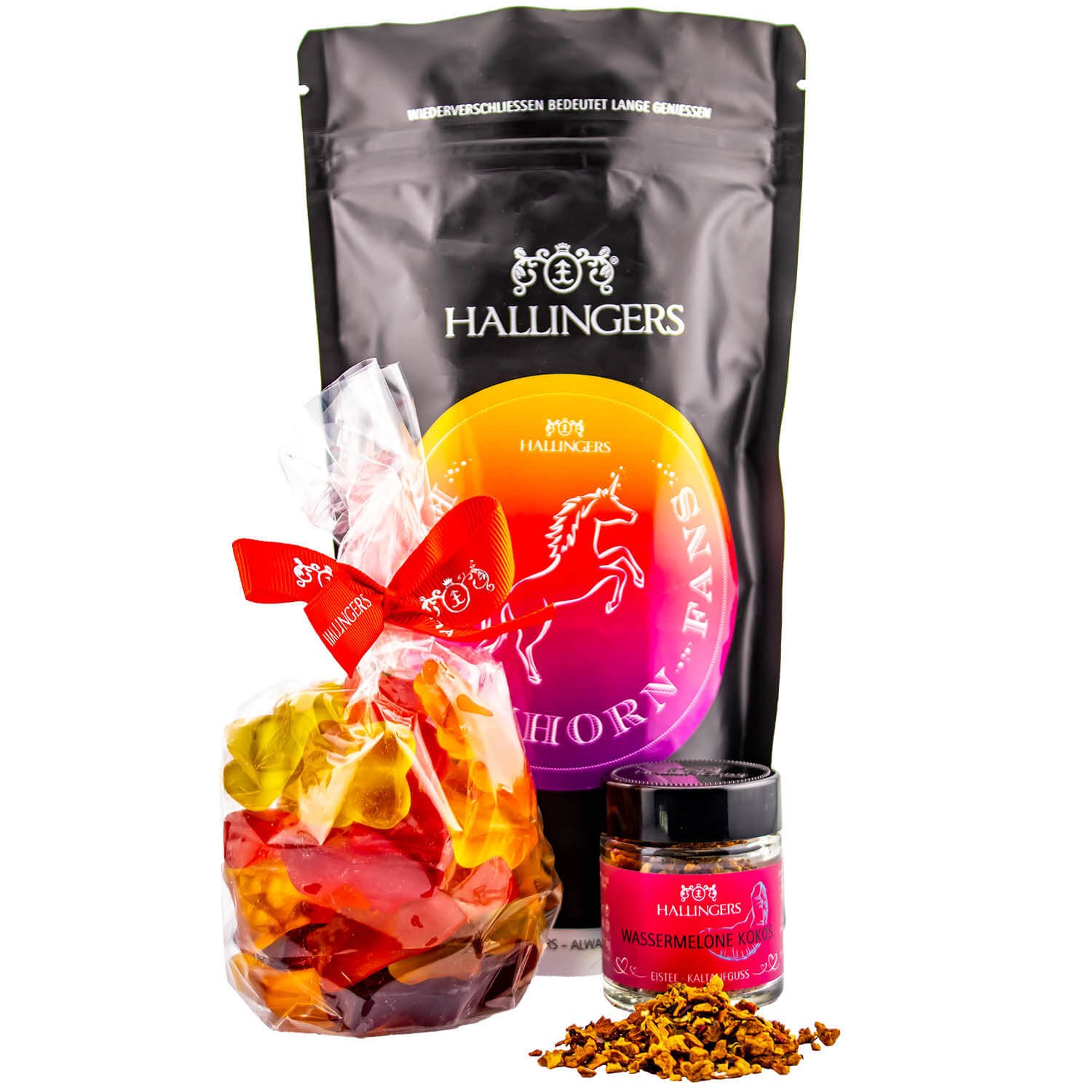 Geschenkkorb Geschenkset – Feinkost Mix, Valentinstag Unicorn Wundertüte Fruchtsaftbärchen & Coldbrew Eistee für Mädchen (159g) - Für Einhorn Fans