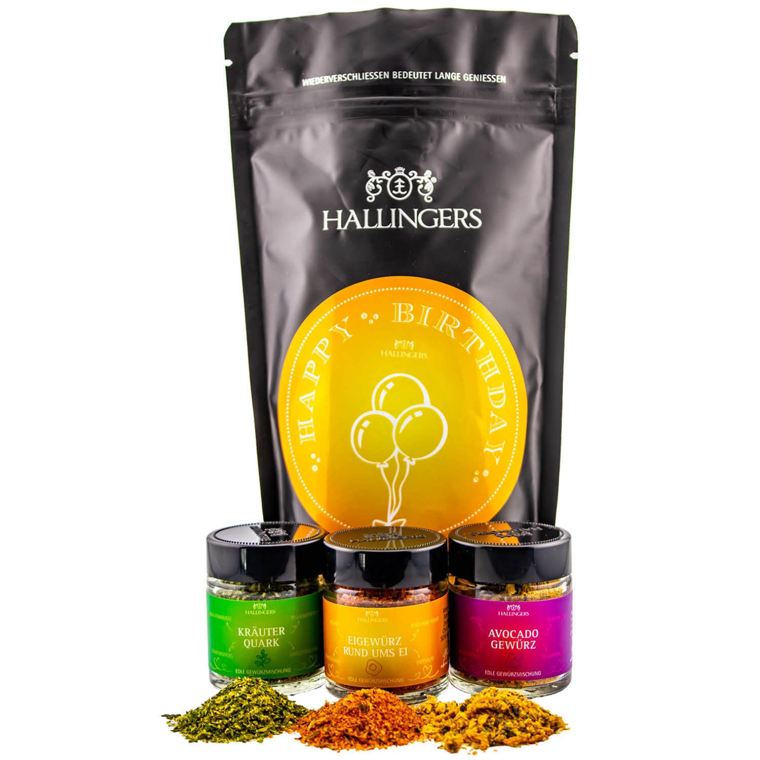 Geschenkkorb Geschenkset – Feinkost Mix, Geburtstag Wundertüte Kräutergewürz, Eigewürz & Avocado Gewürz - zum Jubeltag "Happy Birthday Yellow" (43g) -