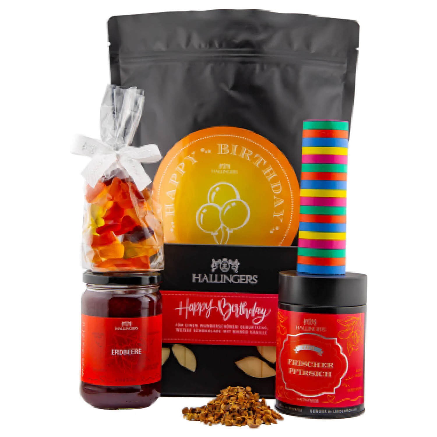 Geschenkkorb Geschenkset – Feinkost Mix, Geburtstag Wundertüte XXL Konfitüre Coldbrew Tee Tafel Schokolade & Fruchtsaftbären, "Happy Birthday Yellow X