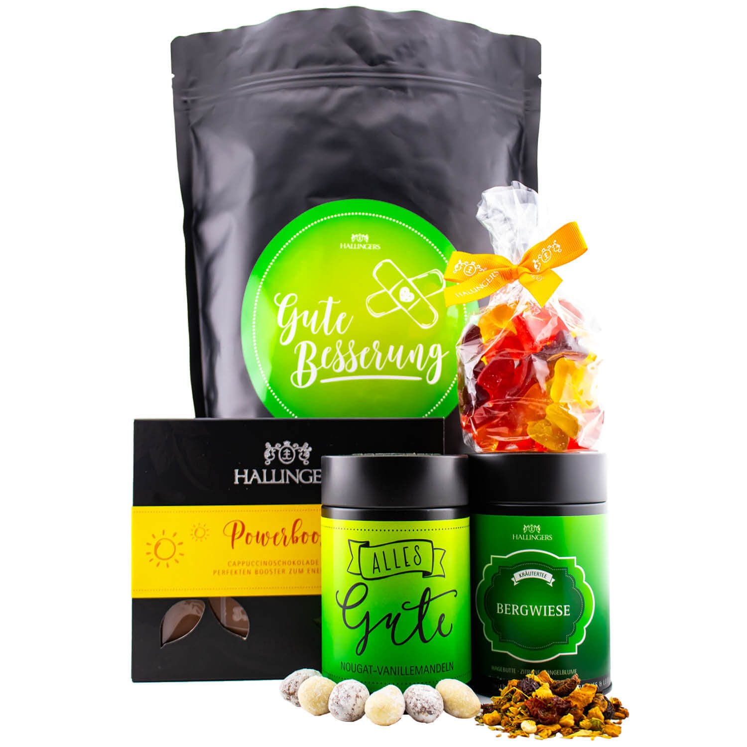 Geschenkkorb Geschenkset – Feinkost Mix, Gesundheit Wundertüte XXL Nougat Mandeln Tee Tafel Schokolade & Fruchtsaftbären (450g) - Gute Besserung XXL