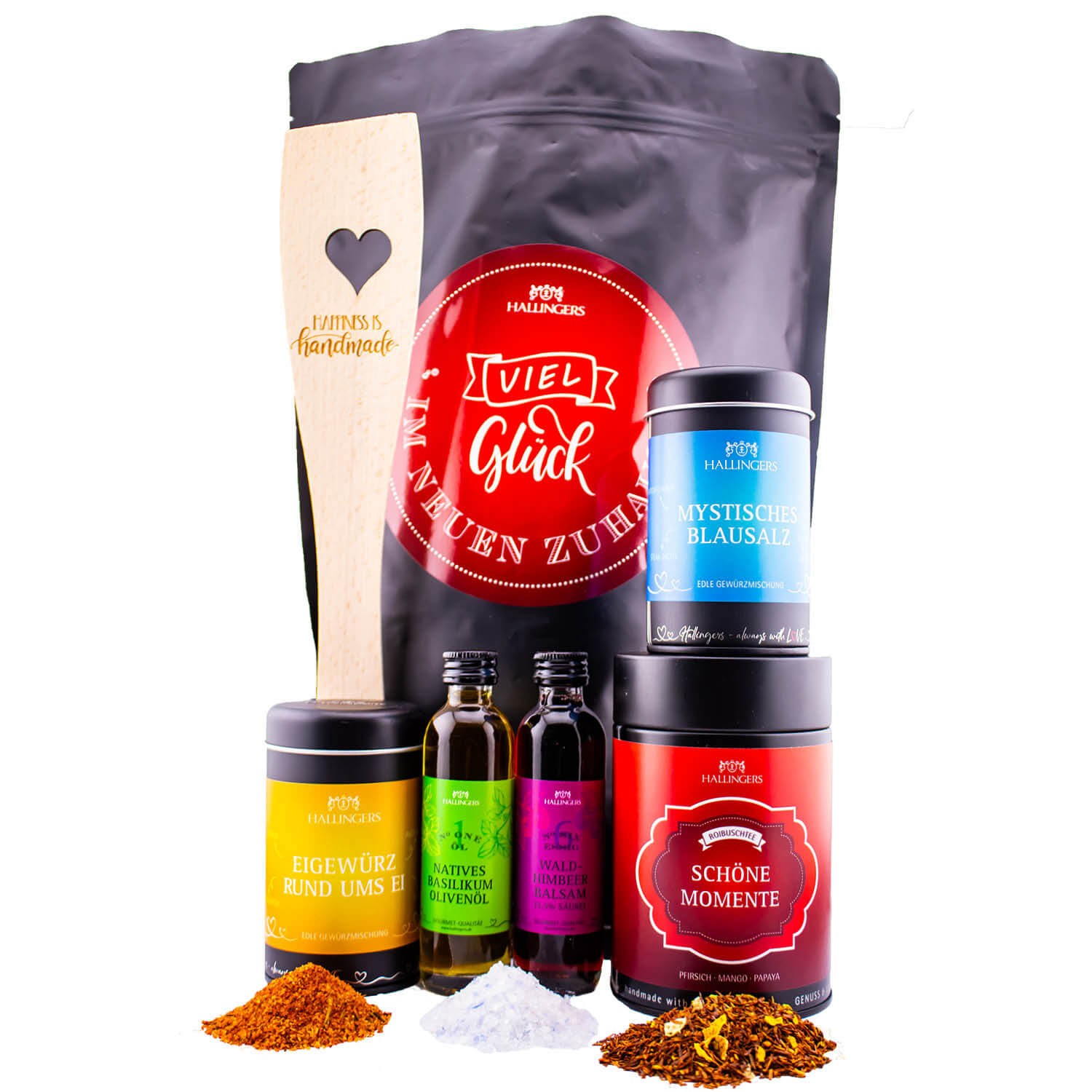 Geschenkkorb Geschenkset – Feinkost Mix, Glückwünsche Wundertüte XXL Olivenöl Essig Ei Gewürz Salz Tee & Pfannenwender (410g) - Viel Glück im neuen Zu
