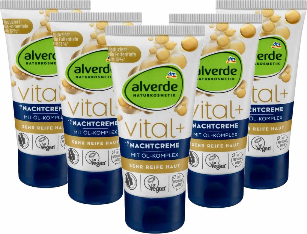 5 x alverde Naturkosmetik - Vital+ Nachtcreme / Gesichtscreme mit Öl-Komplex (5 x 50 ml)