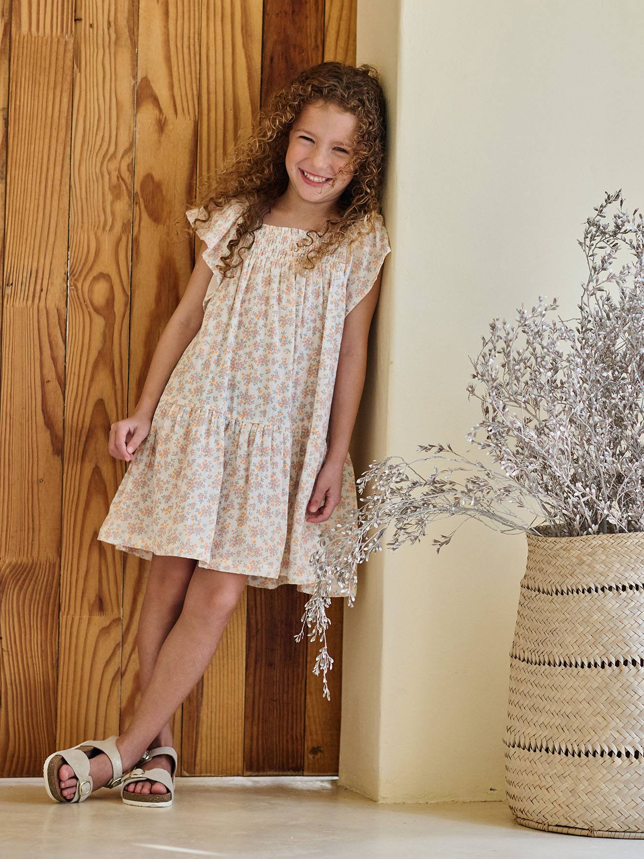 Gesmoktes Kleid mit Blumen Mädchen vanille Gr. 146/152 von vertbaudet