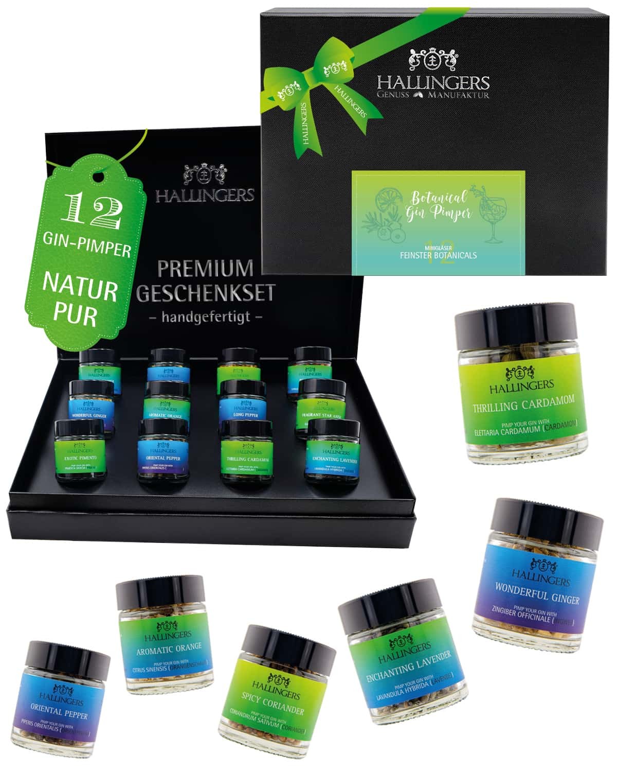 Gin Botanicals Geschenkset – 12 Premium Kräuter & Gewürze im Glas, edle Box zum Verfeinern von Gindrinks "Botanical Gin Pimper XL", Geschenkidee für M