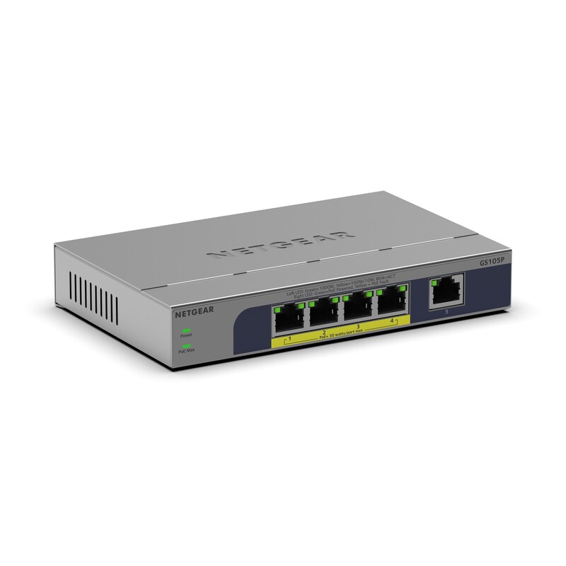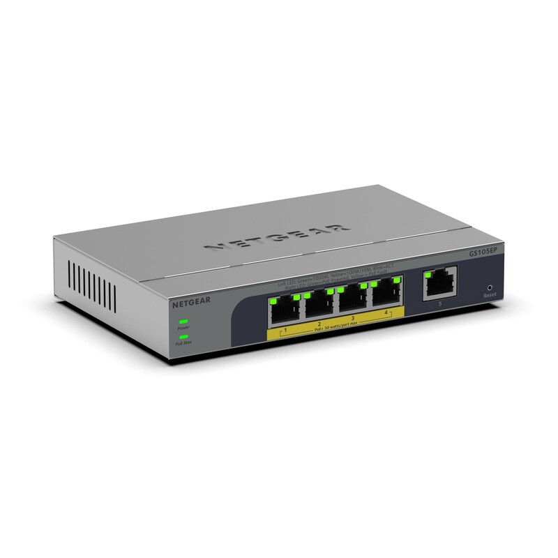 NETGEAR GS105EP 5-Port Gigabit Ethernet PoE+ Plus Switch, PoE Budget 63 W, lüfterlos, Metallgehäuse