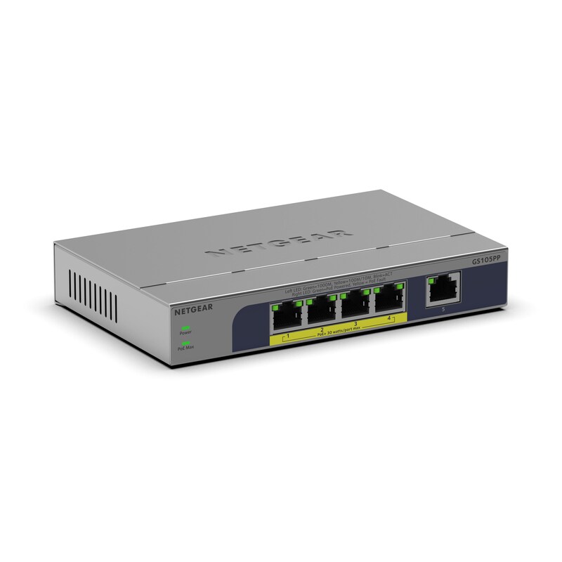 NETGEAR 5-Port Gigabit Ethernet Unmanaged PoE+ Switch (GS305PP): mit 4 PoE+ bei 83 W, Desktop- oder Wandbefestigung