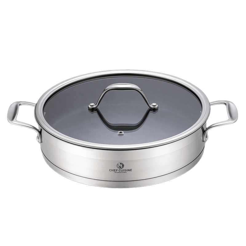 CHEF CUISINE Servierpfanne Ø 28 cm, Edelstahl 18/10, Teflon Antihaftbeschichtung, Glasdeckel, tropffreier Schüttrand, für alle Herdarten geeignet