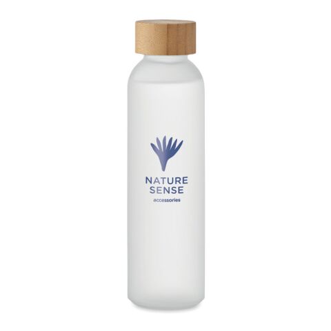 Werbeartikel 500ml Glasflasche gefrostet mit Bambusdeckel auslaufsicher & edel matt nachhaltig – transparent weiß – mit Logo bedruckt