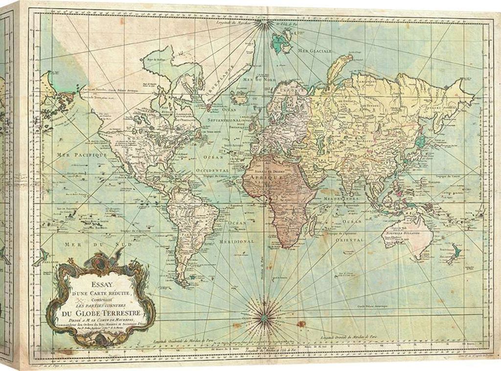 Leinwandbild, Weltkarte - Jacques Nicolas Bellin, Essay d'une Carte reduite du Globe Terrestre, 1778 – 60x40 cm
