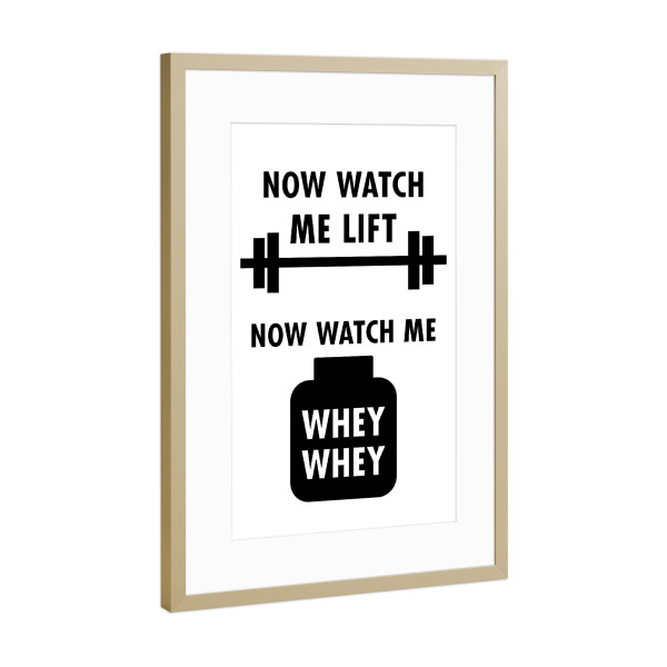 Poster mit Rahmen Gold "Watch me lift watch me whey whey" artboxONE - Typografie,Schwarzweiß,Sport,Sport / Motivation