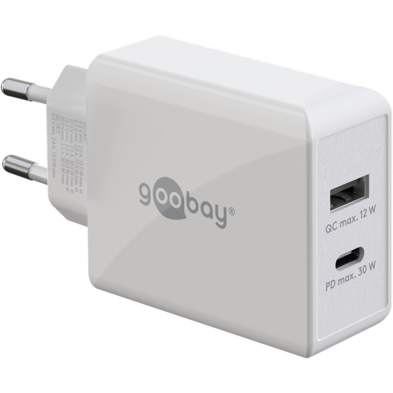 goobay USB-C PD Dual-Schnellladegerät 30 Watt Ladegerät, weiß, 1x USB-A, 1x