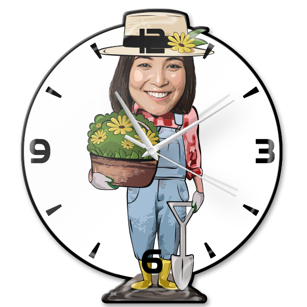 Wanduhr mit Gesicht einer Gärtnerin – die einzigartige Comic-Uhr für grüne Daumen – Liebevoll gestaltet für leidenschaftliche Gartenfreundinnen!