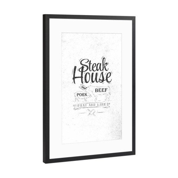 Poster mit Rahmen Schwarz (Metallic) "Steak house" artboxONE - Essen & Trinken - Steak,House,Beeа,Cow,Meat,Wine,Grill,Bbq,Buffalo,Retro,Vintage