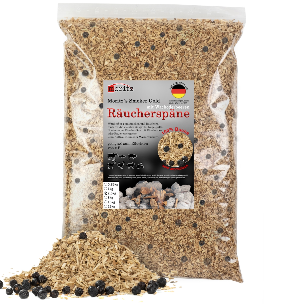 Moritz 2,5kg Räucherspäne Buche mit Wacholder fein 0,75 -2 mm Räuchern I Kalträuchern von Fisch Fleisch Wurst Käse auch für BBQ I Grill - Räuchermehl