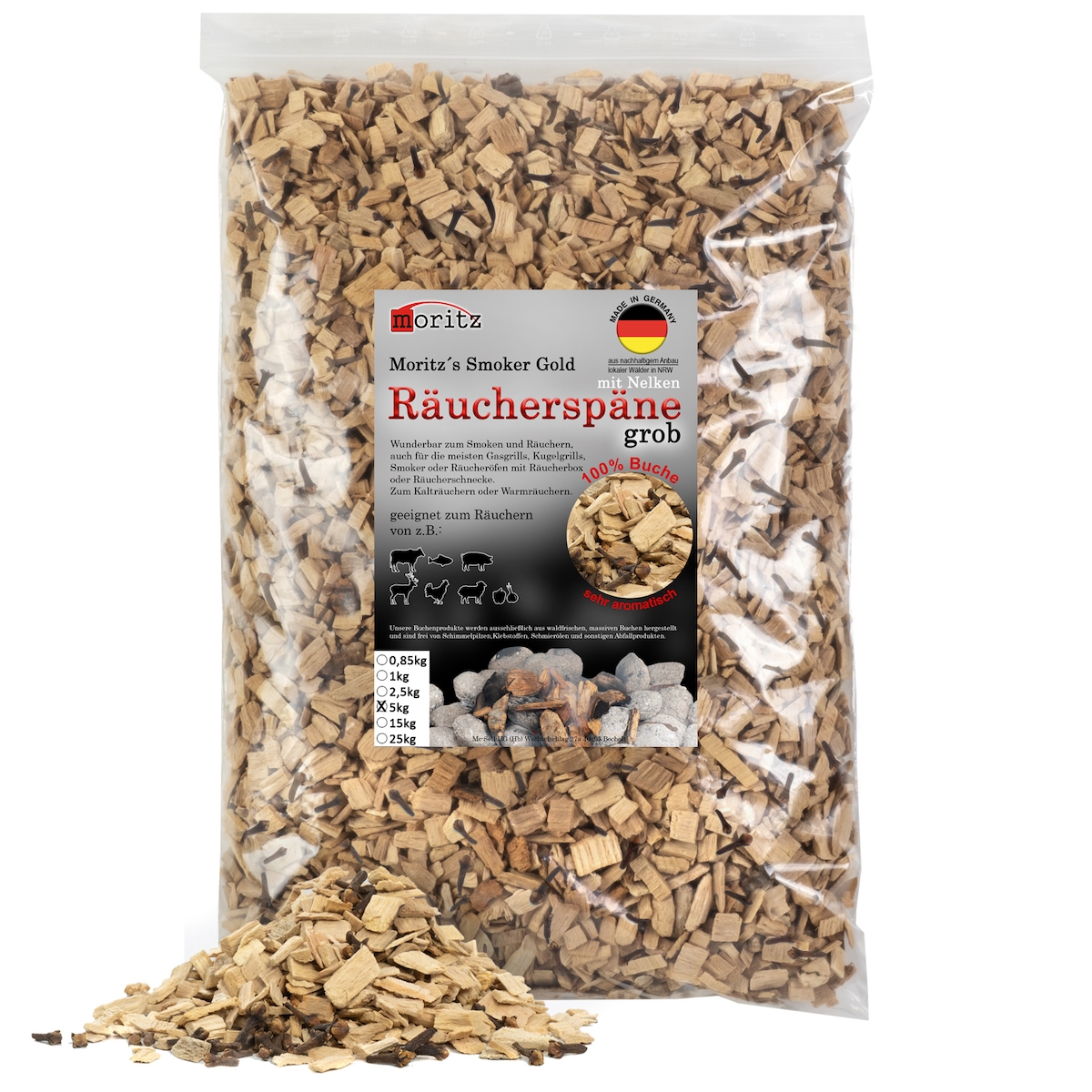 Moritz 5kg Räucherspäne Buche mit Nelke grob 6 -12 mm Räuchern I Kalträuchern von Fisch Fleisch Wurst Käse Gemüse auch für BBQ I Grill - Räuchermehl