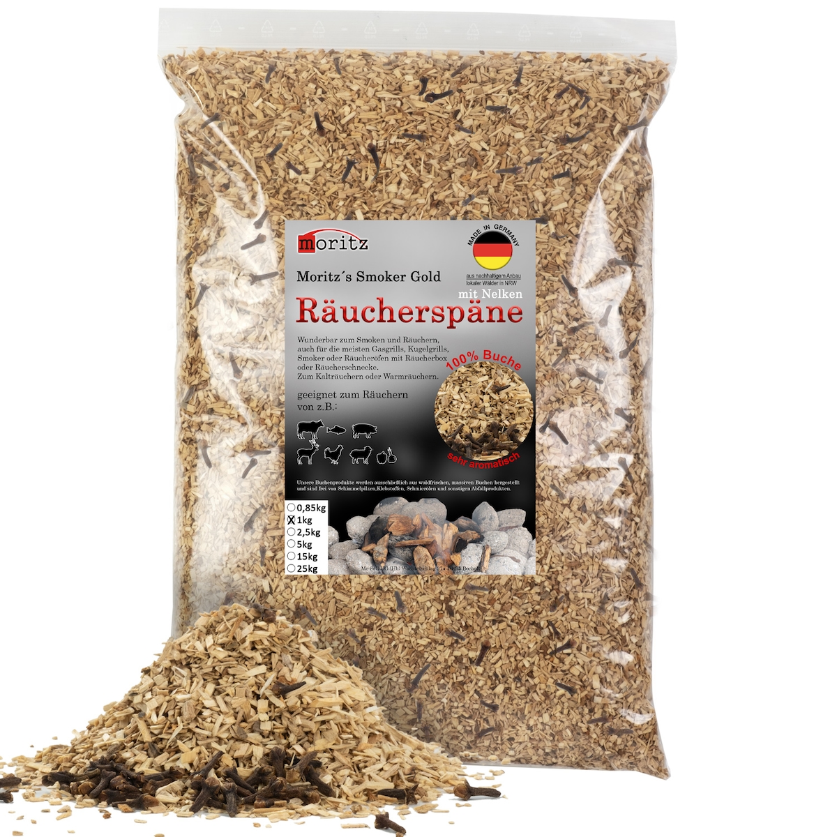 Moritz 0,85kg Räucherspäne Buche mit Nelke grob 6 -12 mm Räuchern I Kalträuchern von Fisch Fleisch Wurst Käse Gemüse auch für BBQ I Grill - ...