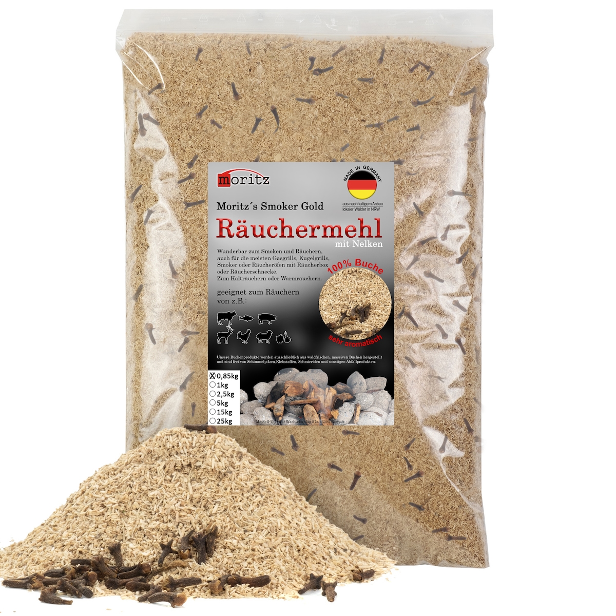 Moritz 0,85kg Räuchermehl Buche mit Nelke fein 0,5 -1 mm Räuchern I Kalträuchern von Fisch Fleisch Wurst Käse auch für BBQ I Grill - Räucherspäne