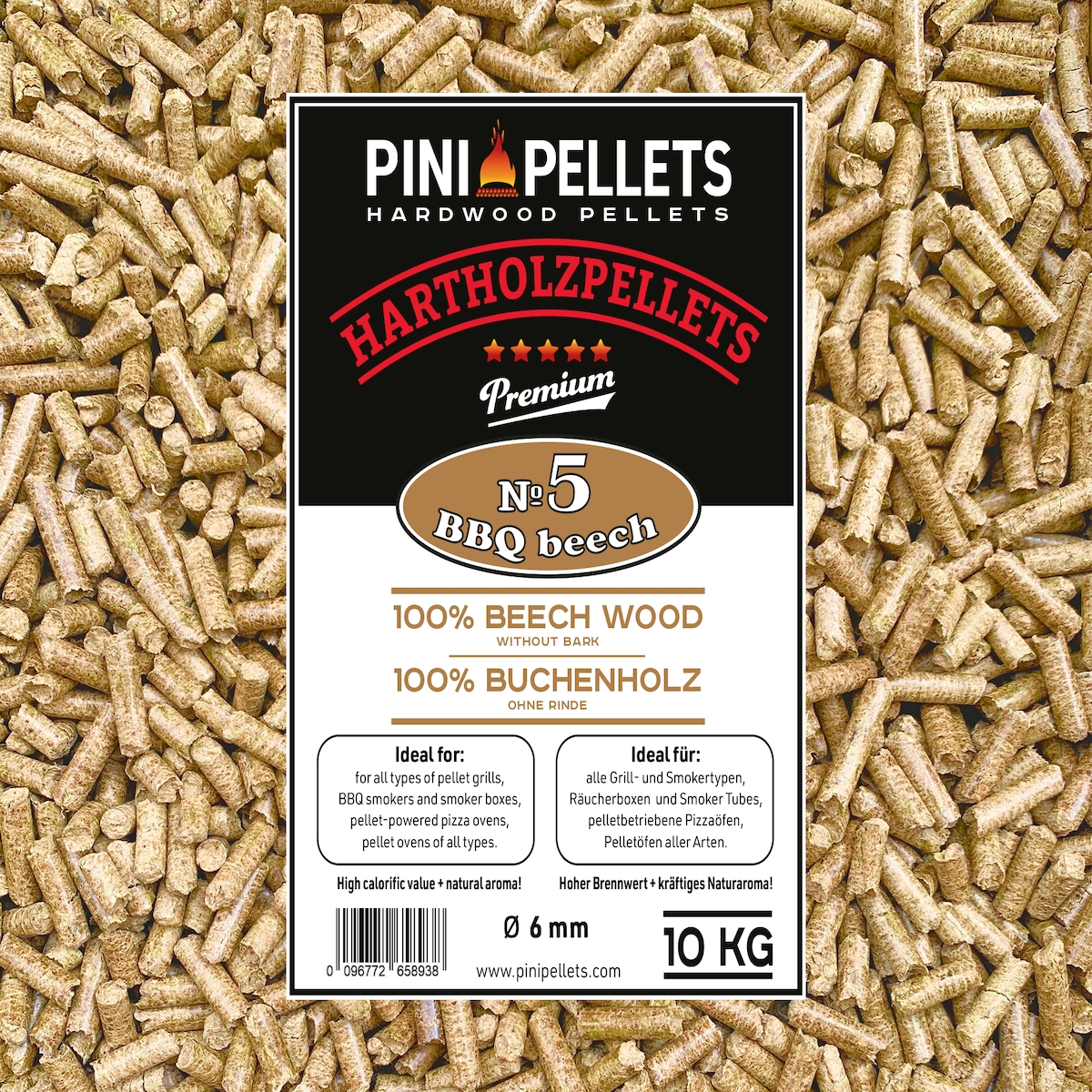 PINI Hartholz Pellets 100% Buche Nr. 5 BBQ Beech 10 Kg Grillpellets zum Grillen Räuchern Smoken