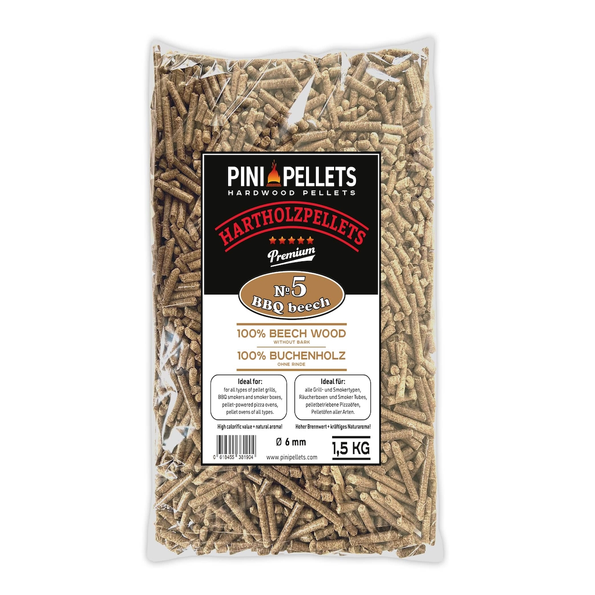PINI Hartholzpellets 100% Buche No 5 BBQ Beech 1,5 Kg Grillpellets zum Grillen Räuchern Smoken und für Pizzaofen