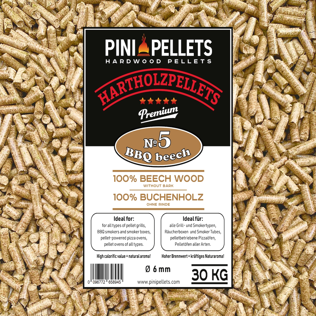 PINI Hartholzpellets 100% Buche Nr. 5 BBQ Beech 30 Kg Grillpellets zum Grillen Räuchern Smoken Heizen