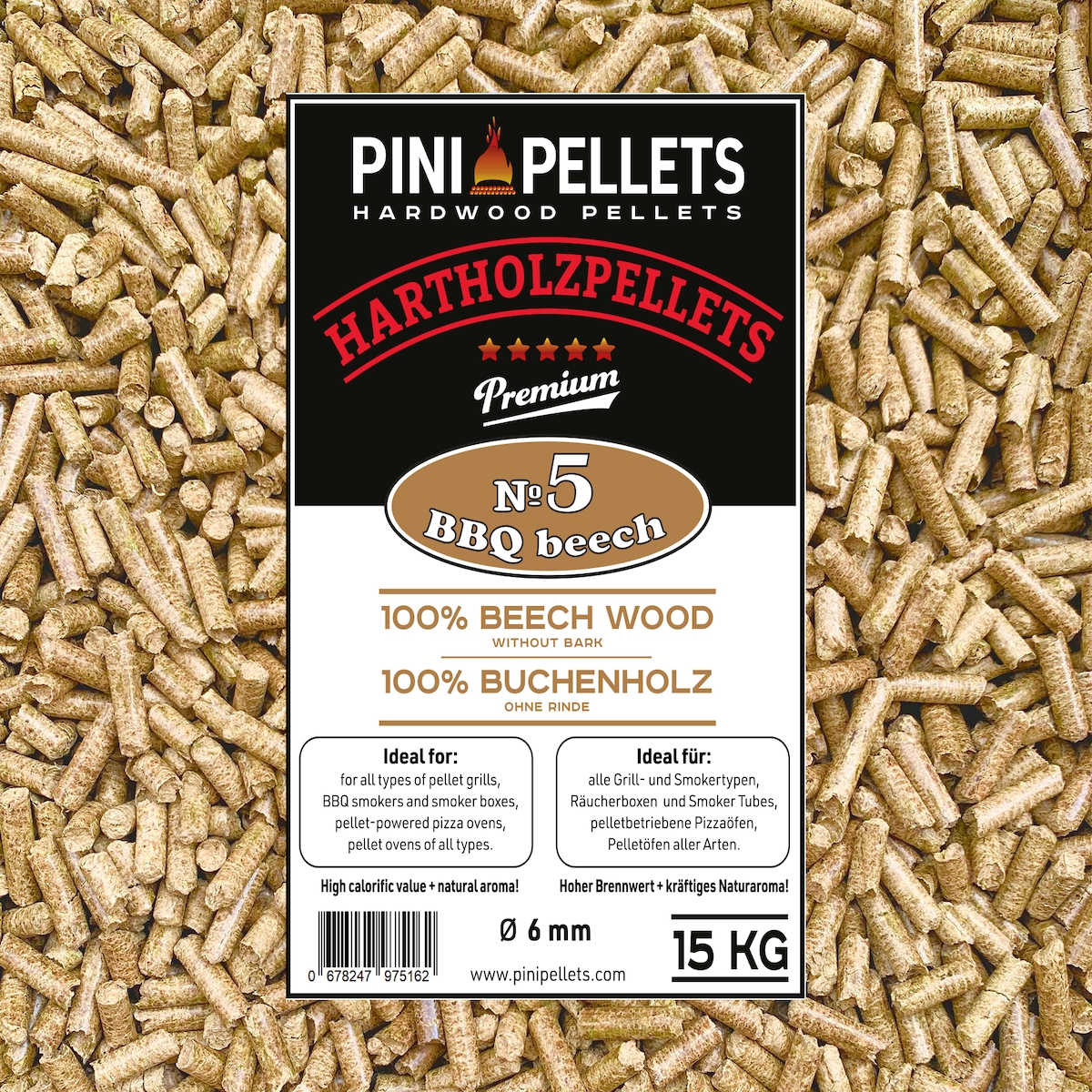 PINI Hartholzpellets 100% Buche No 5 BBQ Beech 15 Kg Grillpellets zum Grillen Räuchern Smoken