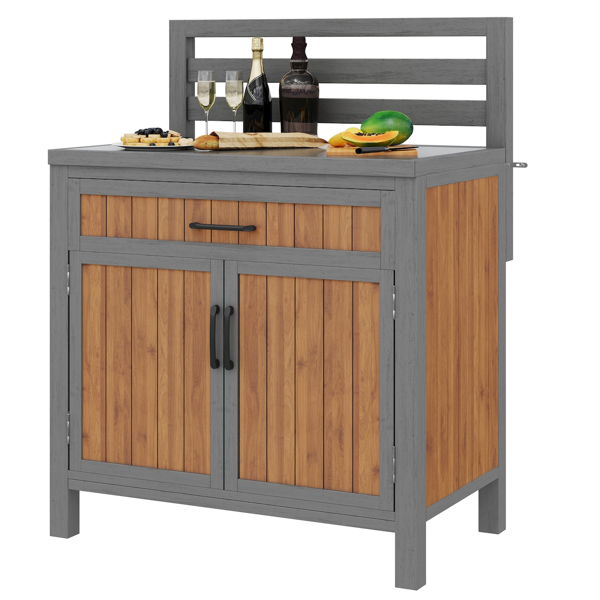 Merax Garten Küchenschrank, Holz, Arbeitsfläche & Schublade, Geräteschrank & Grillstation mit verstellbaren Regalen, Grau+Massivholzfarbe