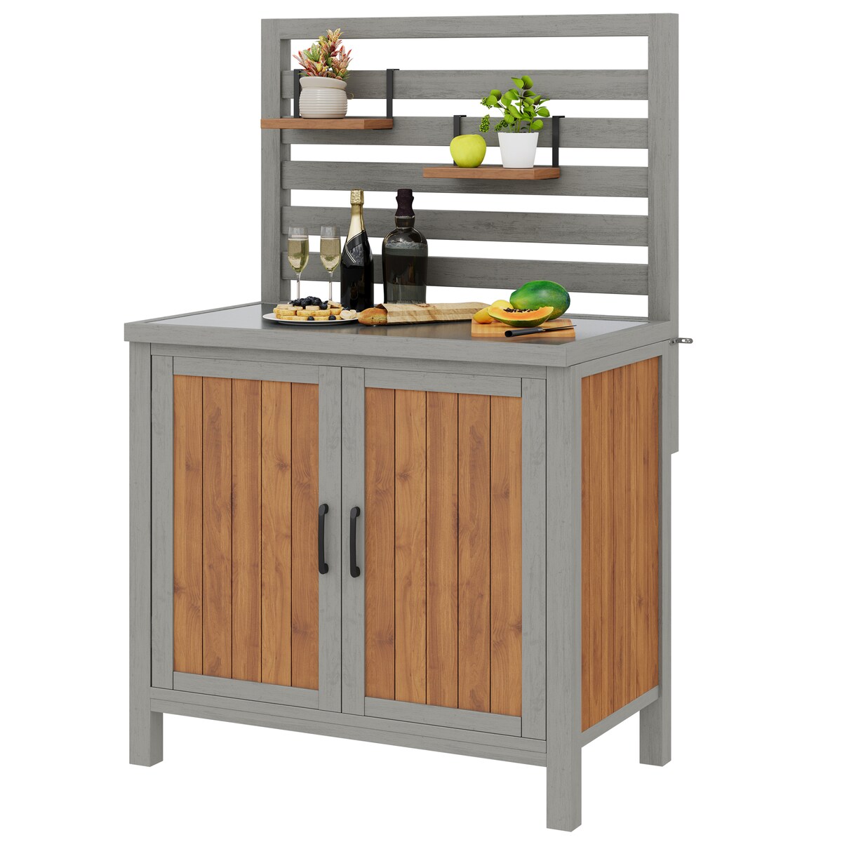 Merax Garten Küchenschrank, Holz mit Edelstahl-Arbeitsplatte, Geräteschrank & Grillstation, verstellbare Regale & Staufächer, Grau+Massivholzfarbe