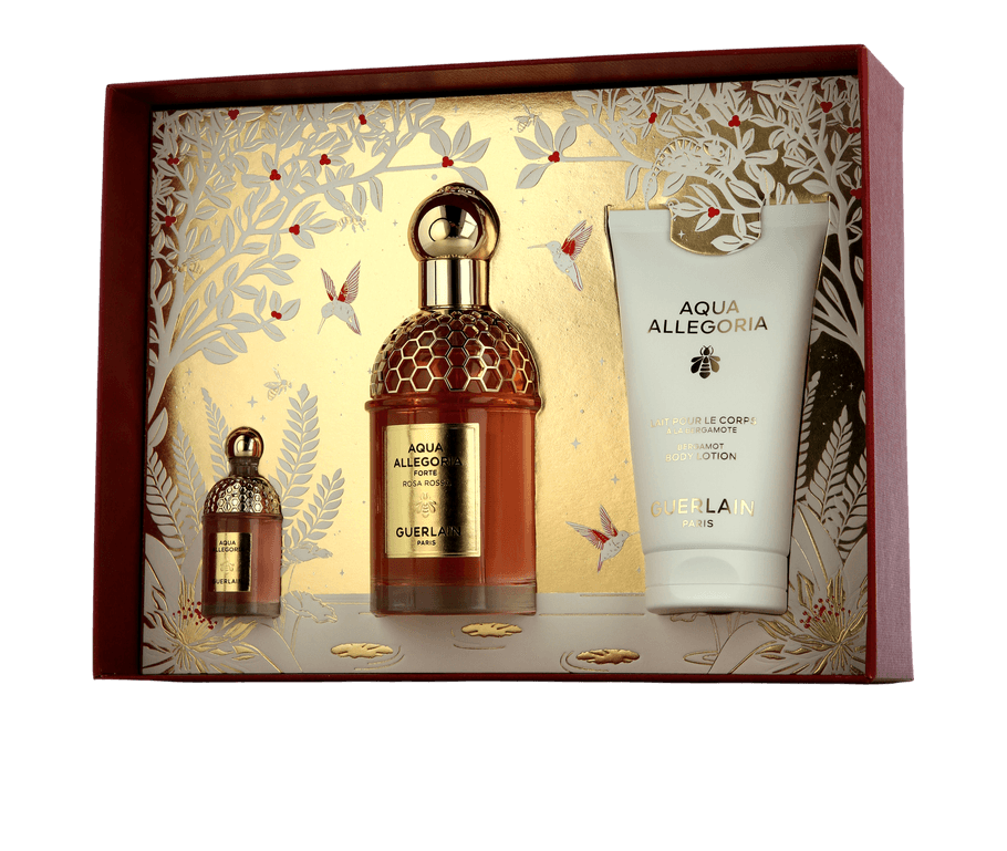 Guerlain Aqua Allegoria 75 ml EdP Set mit Rosa Rossa Forte EdP Spray, Mini EdP & Body Lotion
