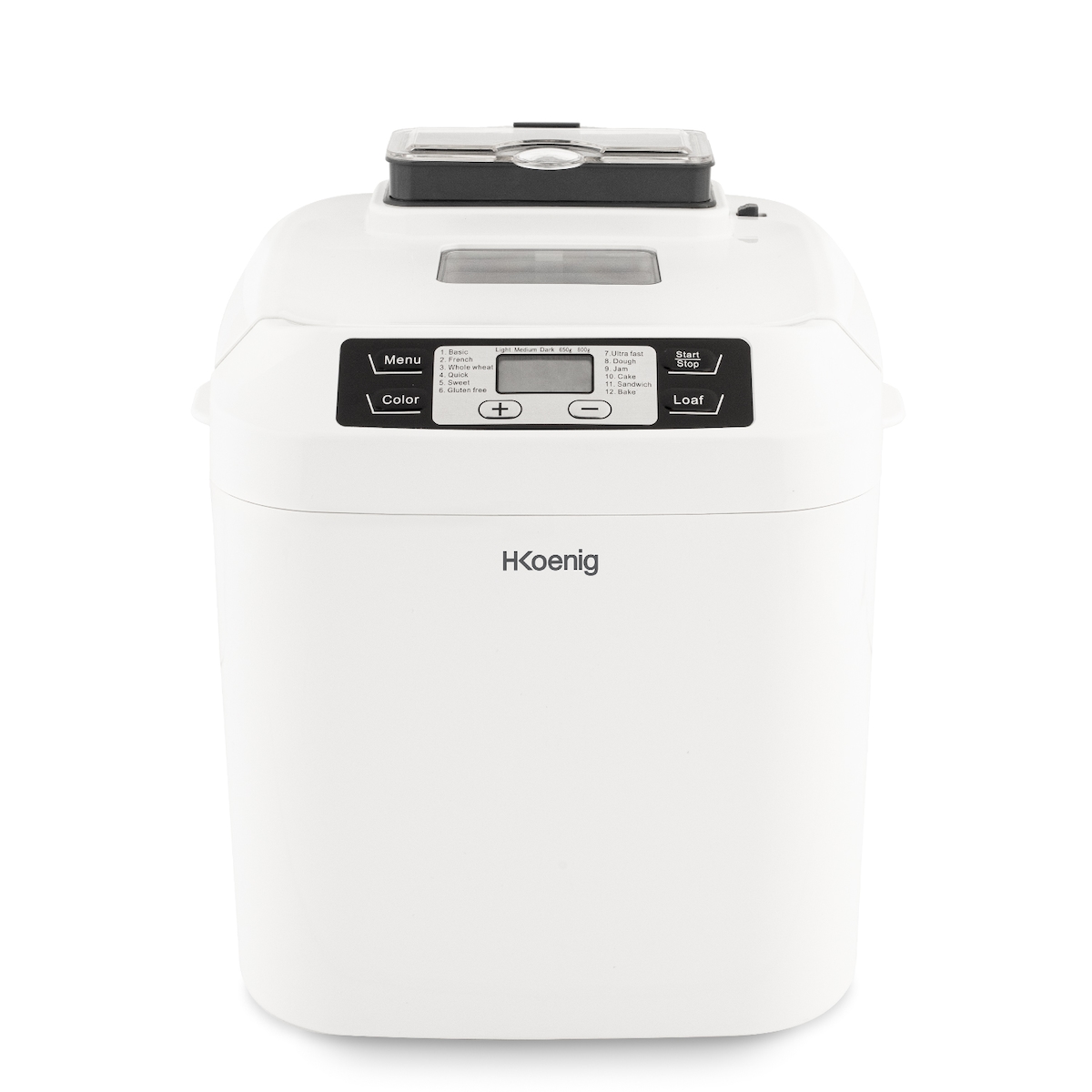 H.Koenig BAKE340 Brotbackautomat, 12 Programme, 2 Brotgrößen, Startzeitvorwahl und Warmhaltefunktion, LCD-Display, 550 Watt, Weiß