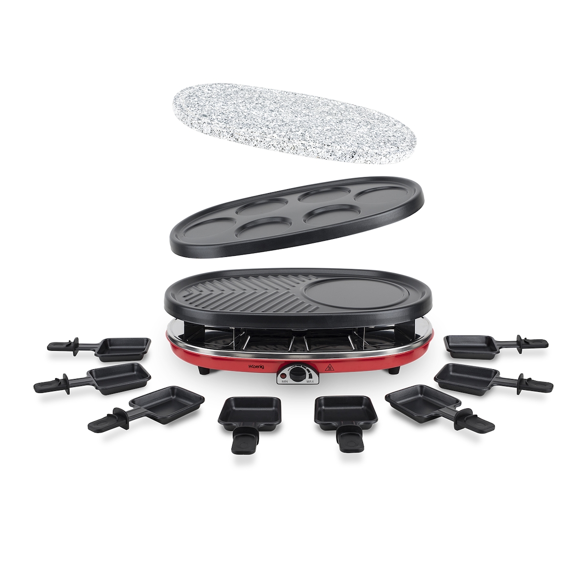 H.Koenig RP418 Raclette-Gerät 4 in 1 / 8 Personen / Raclette, Natursteingrill, Crepe-Platte und Grillplatte / mit 8 Pfännchen / 1500 W / Schwarz/Rot