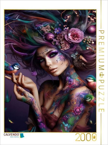 CALVENDO Puzzle Portrait einer Frau mit lilafarbenen organischen Haarschmuck und Paradiesvögeln auf der Hand | 2000 Teile Lege-Größe 90x67cm Foto-Puzz