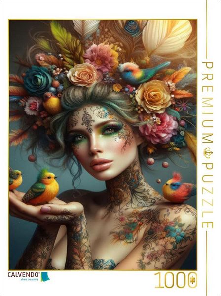 CALVENDO Puzzle Portrait einer Frau mit gelben organischen Haarschmuck und Paradiesvögeln auf der Hand | 1000 Teile Lege-Größe 64x48cm Foto-Puzz...
