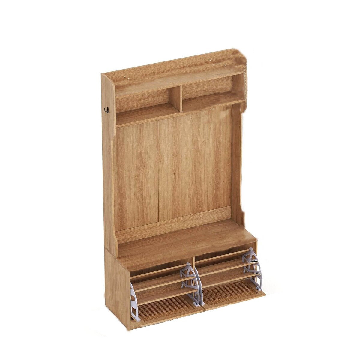 COSTWAY 4-in-1-Garderobe mit Bank, 2 Klappen, 4 doppelten Hakenleisten und PE-Rattan-Türen, Eingangsschrank für den Eingangsbereich