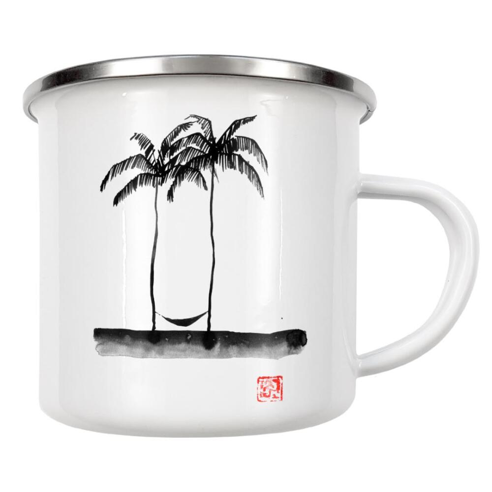 Emaille Tasse "Hamac" artboxONE - Natur - Hamac,Plamtree,Sumie,Japan,Palmen,Palmtress,Natur,Natuer,Schwarzweiß,Blackandwhite,Strand,Beach