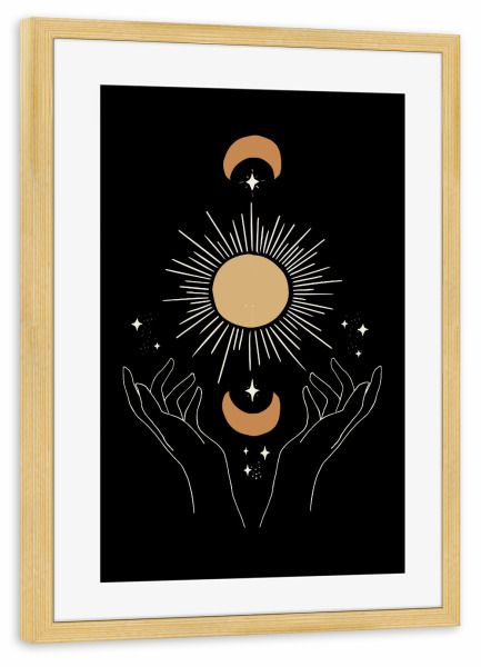 Poster mit Rahmen kiefer "Celestial Hands Sun Moon Stars" artboxONE - Natur,Liebe,Galaxy