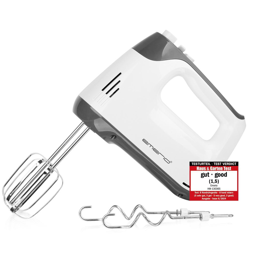 Emerio Handmixer 400 W – Mixer mit Turbofunktion – 5 Geschwindigkeitsstufen – Edelstahl-Rührbesen und Knethaken – HM-130365 – Weiß / Grau
